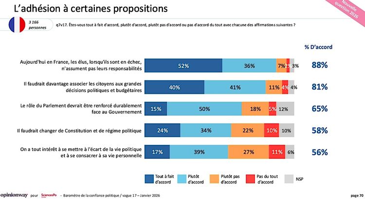 Parmi les reproches les plus éclatants : les responsables politiques ne se préoccupent pas de ce que pensent les gens (87%, +4) ; les dirigeants politiques sont plutôt corrompus (76%, +2) ; les élus, lorsqu'ils sont en échec, n'assument pas leurs responsabilités (88%).