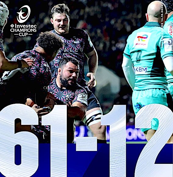 L’Aviron Bayonnais a quasiment perdu toute chance de se qualifier pour les 8e de finale de la Champions Cup, dans un Groupe 3 très relevé. Après la défaite à domicile face aux très solides Sud-Africains des Stormers (17-26), ils ont été emportés par la marée anglaise. En janvier, les Basques affronteront deux autres très gros calibres, les Irlandais du Leinster et les Anglais de Leicester. Sans commentaires !